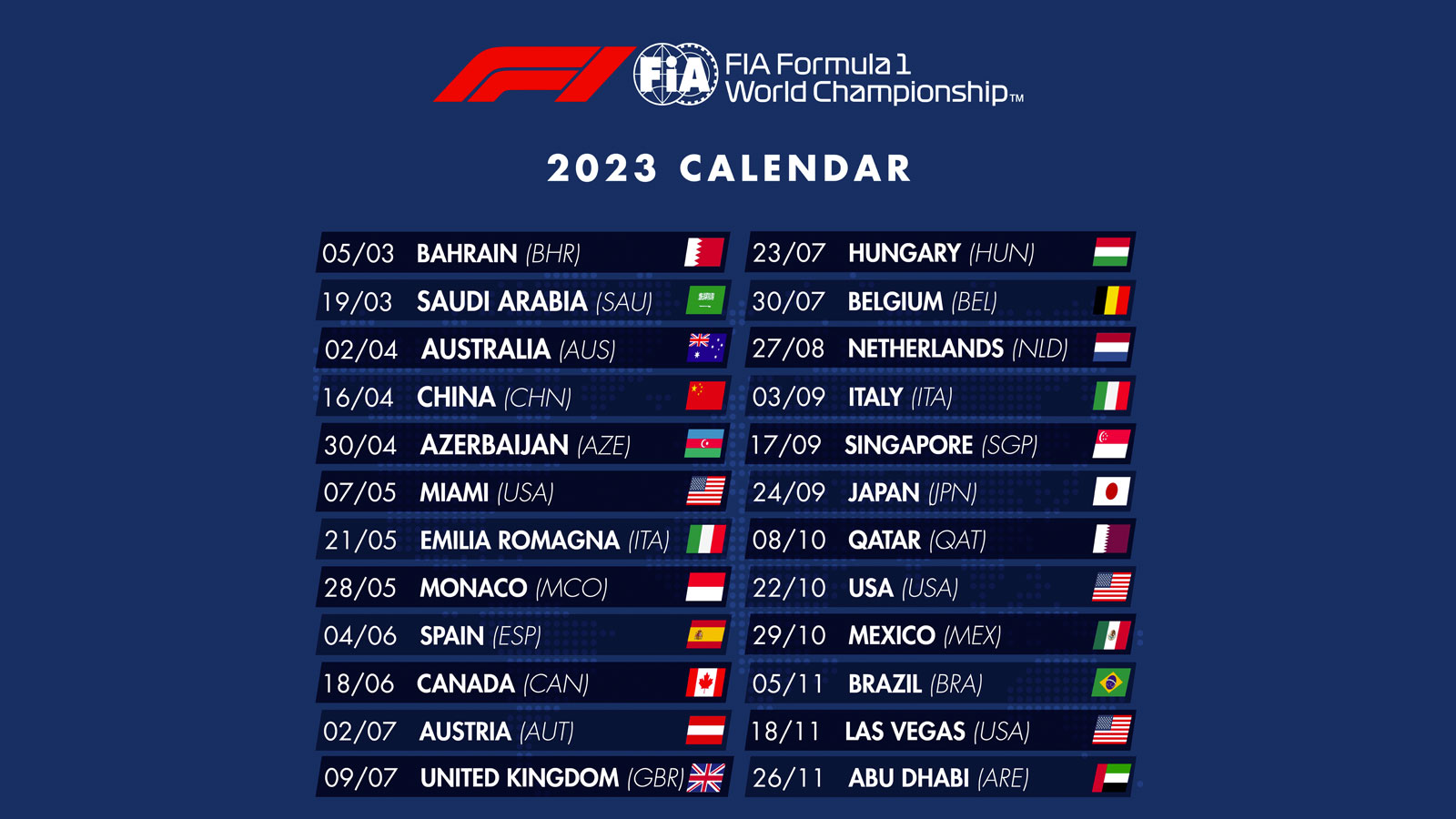 Formel-1 Kalender 2023 bekannt gegeben Überraschend hat die FIA bereits heute den Formel-1 Kalender für die Weltmeisterschaft 2023 bekannt gegeben. 20. Sep. 2022